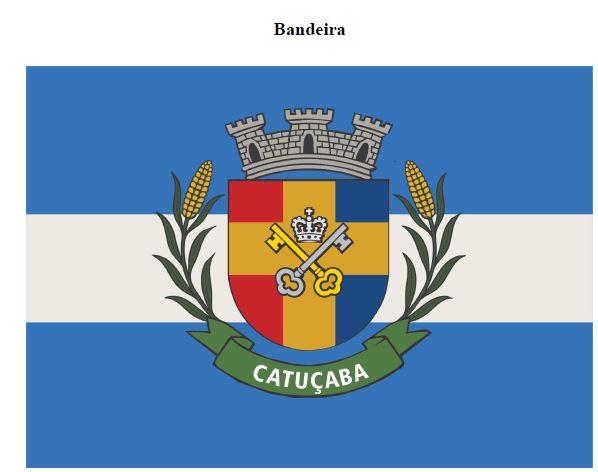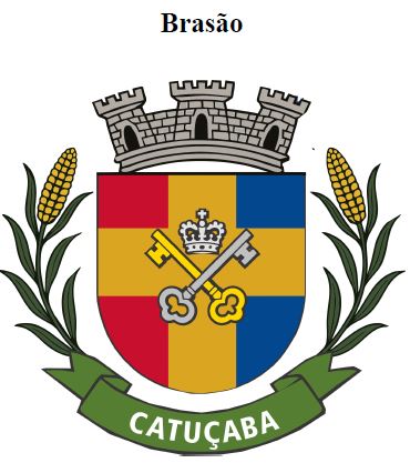 O escudo é ladeado por ramos de milho, representando a tradição agrícola local, e encimado por uma coroa mural de três torres, símbolo da condição de distrito. Na base, o listel verde com a inscrição “CATUÇABA” remete à fertilidade da terra e à origem indígena do nome, que significa “lugar bom” ou “mato bom para caça”