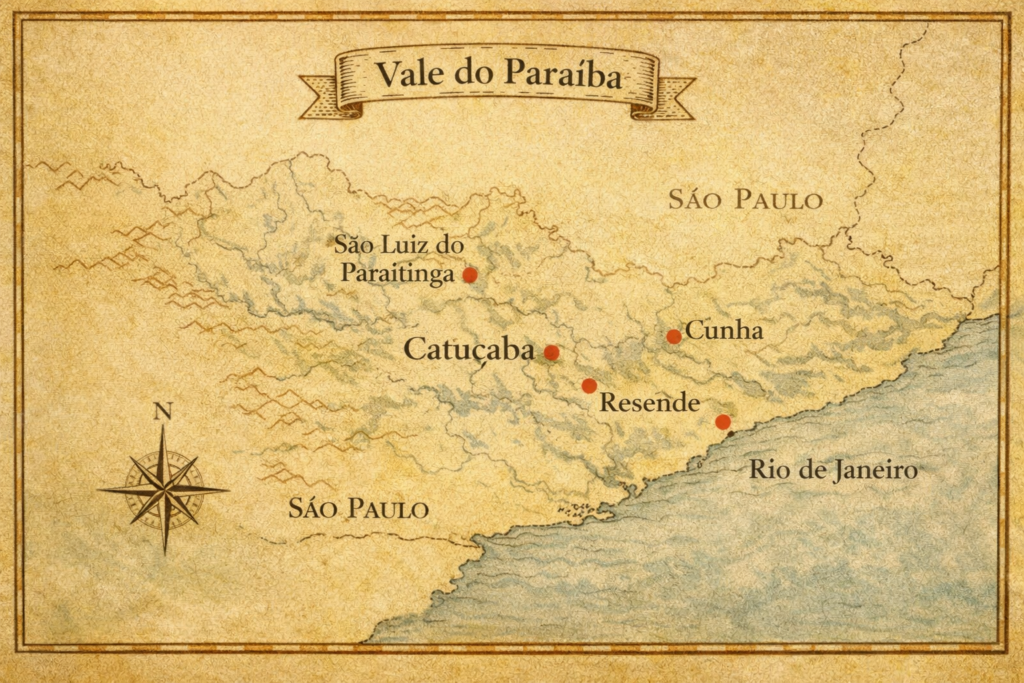 Mapa ilustrativo da região do Vale do Paraíba, destacando Catuçaba e áreas próximas onde ocorreram movimentações durante a Revolução Constitucionalista de 1932.